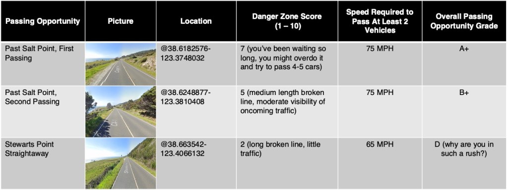 The good news is that there are two consecutive passing opportunities just past Salt Point State Park that where you can safely leave these clods behind.