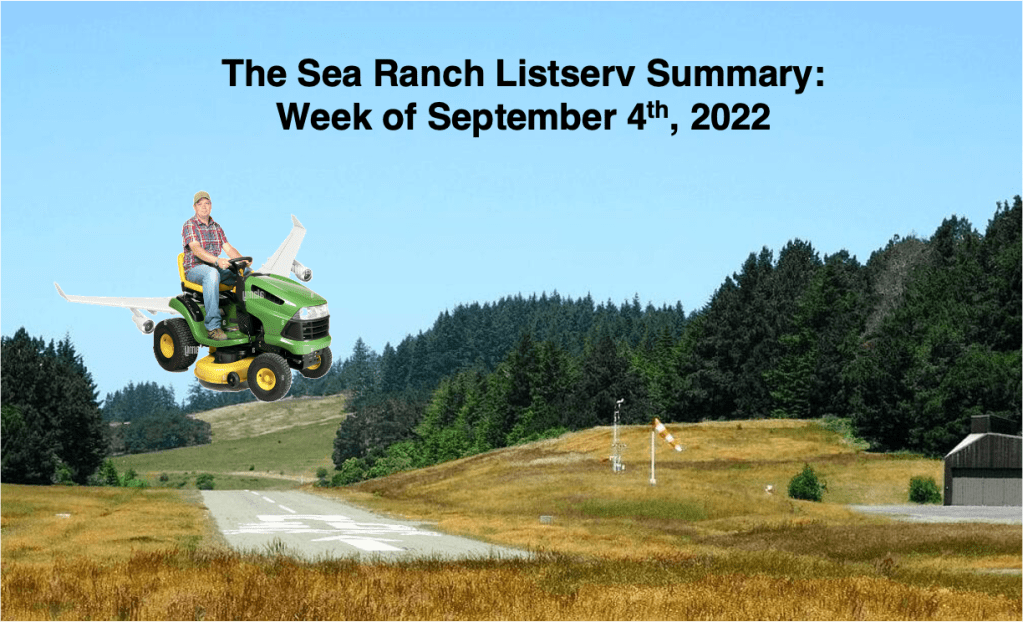 Listserv members were in week 2 of discussing the pros and cons of commercial aircraft operations at The Sea Ranch airstrip. Those either in favor or ambivalent about larger, louder planes and helicopters using the airstrip said the people who live by the airport knew what they were getting into when they purchased homes or lots there. One member said it’s nice that some people can afford to hire pilots to fly them to The Sea Ranch and, wouldn’t we all do that if we could?
